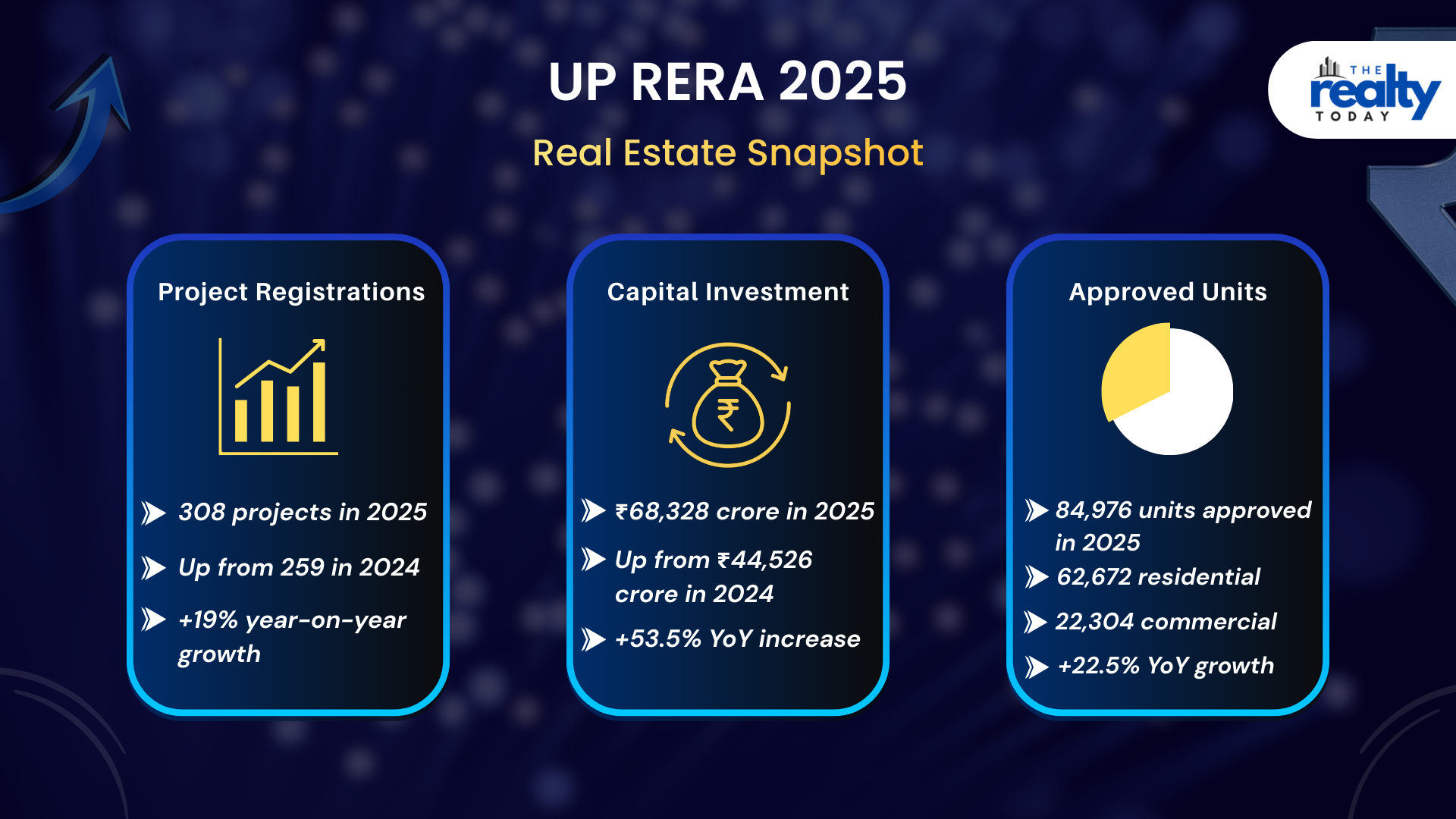 Uttar Pradesh's real estate market showed an encouraging performance in the year 2025, with an increase of 19% in the registration of projects and an increased investment of 53.5% as compared to the previous year, according to the latest report released by the Uttar Pradesh Real Estate Regulatory Authority [UP RERA]. This increase is majorly driven by the Noida region and the other NCR districts, while the 2nd tier cities and religious spots also experienced an encouraging increase, which marks a trend of diversification of the state.