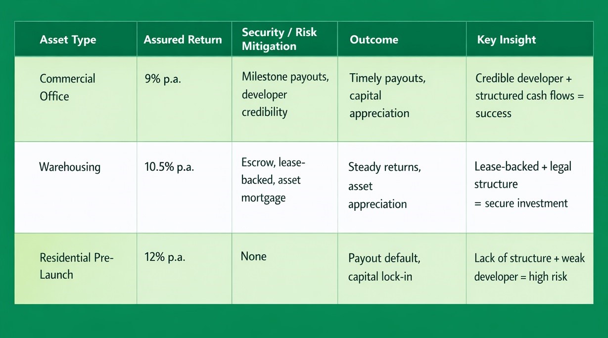 Key learning: Lease-backed structures with escrow accounts provide one of the most secure forms of assured returns.