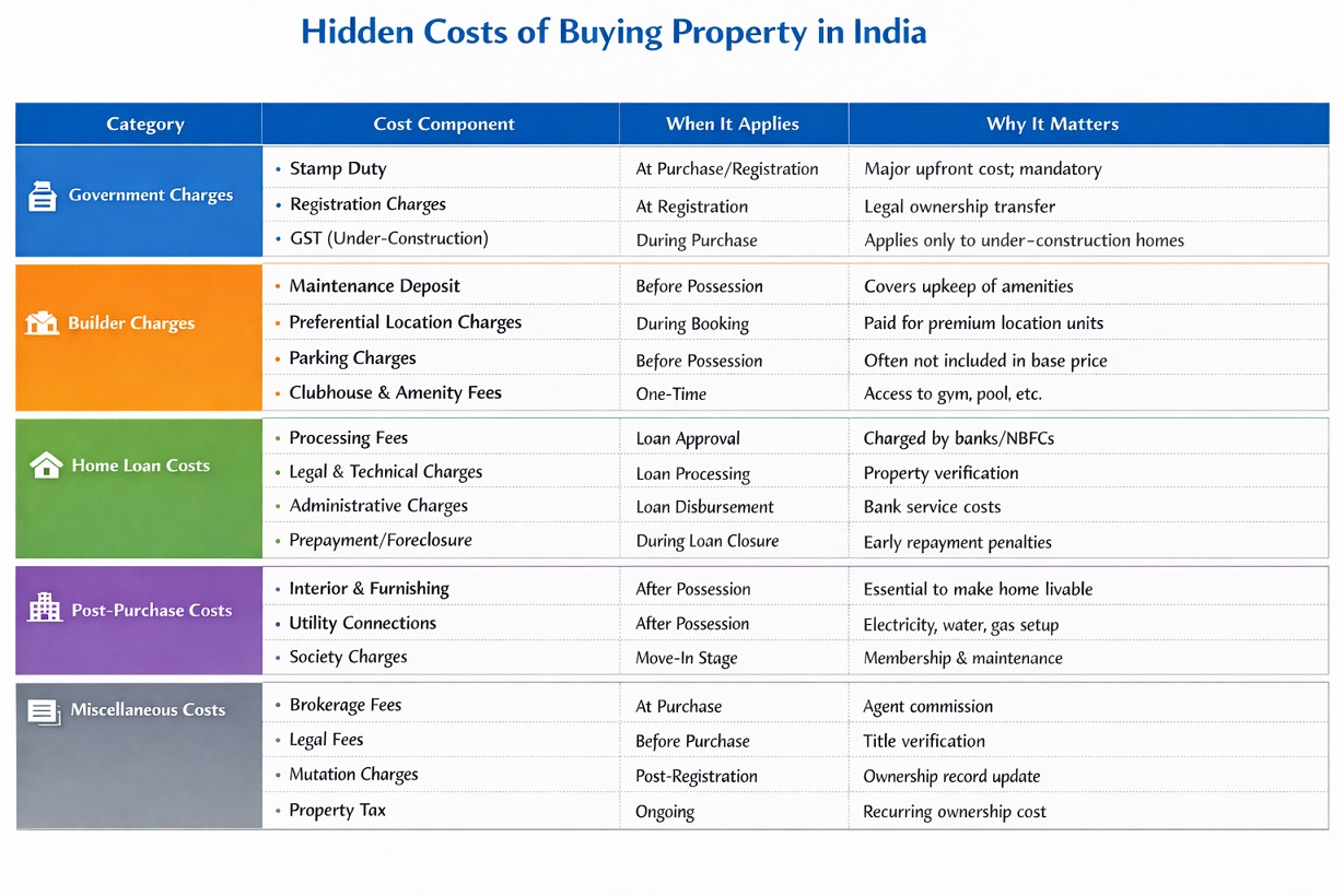 Buying a home is a major milestone in life for many. It usually means that one is financially stable, thinking about the future and is proud of himself/herself. However, most of the buyers tend to focus on the basic price of the property and their monthly EMI, but actually, the true cost of ownership remains hidden to them. A simple purchase may turn into a financial nightmare very easily due to the addition of hidden charges.