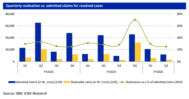 ICRA noted that prolonged resolution timelines have been a key factor contributing to value erosion. Data indicates that nearly three-fourths of ongoing CIRP cases had exceeded 270 days from the date of admission by the National Company Law Tribunal (NCLT) as of September 30, 2025, despite the mandated outer limit of 330 days, including litigation.