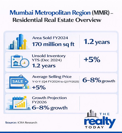 The Mumbai Metropolitan Region (MMR) is the largest residential real estate market among the top seven cities in India. It accounted for 24–25% of the total area sold and 31–33% of the total sales value during FY2024 and 9M FY2025. According to ICRA, MMR is expected to maintain a similar market share of 24–27% in both FY2025 and FY2026.