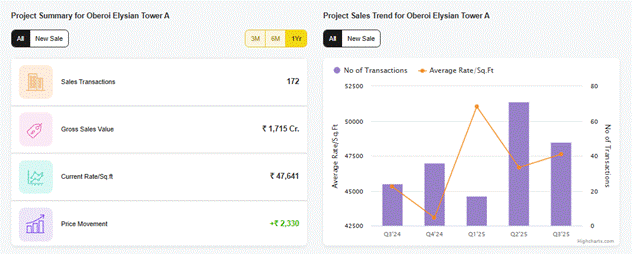 According to Square Yards Data Intelligence, Elysian by Oberoi Realty has recorded 172 sale registrations with a total transaction value of Rs. 1,715 crore. The average property price in the project stands at Rs. 47,641 per sq. ft.