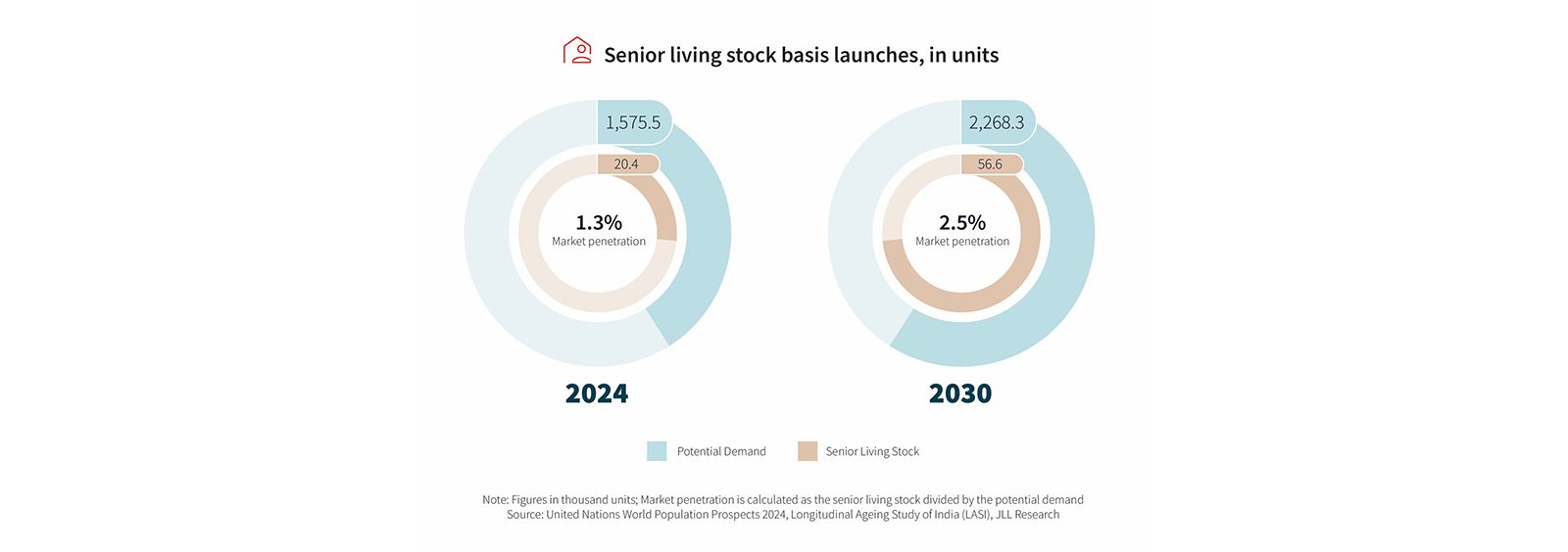 It is anticipated that by 2030, the market for the target segment will double from 1.57 million households in 2024 to 2.3 million households. Elders nowadays are independent, have enough money, are aware of the world, and they actively participate in society, hence they are redefining retirement. Even if senior living inventory is projected to increase twofold by 2030, raising penetration to 2.5%, the gap between demand and supply will still persistthis gap thus may be viewed as the key to a thriving future.