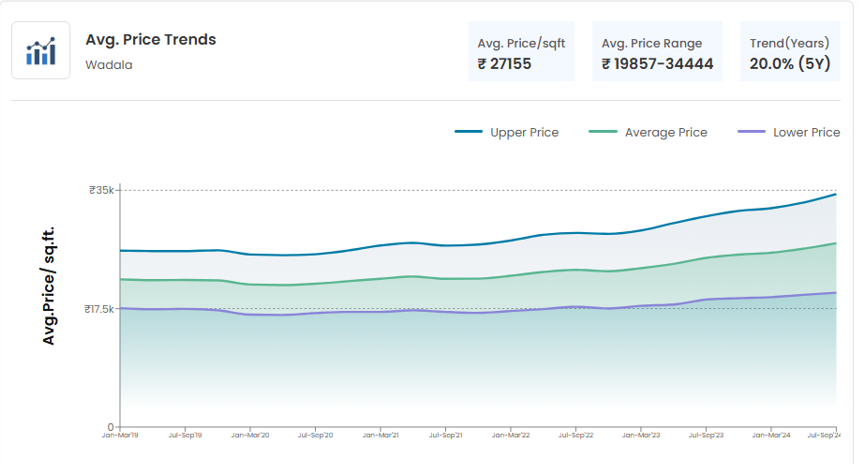 Real estate in Wadala has seen steady growth over the past five years. As per, aurumproptech.in, property prices have appreciated by around 20%, with the average price per square foot at ₹27,155, and a range of ₹19,857–₹34,444. This trend highlights the strong demand for homes and the promising potential for long-term investment.
