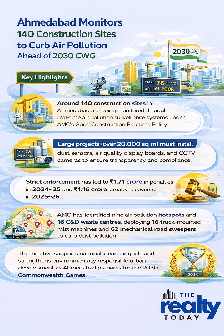 - Around 140 construction sites in Ahmedabad are being monitored through real-time air pollution surveillance systems under AMC’s Good Construction Practices Policy.
