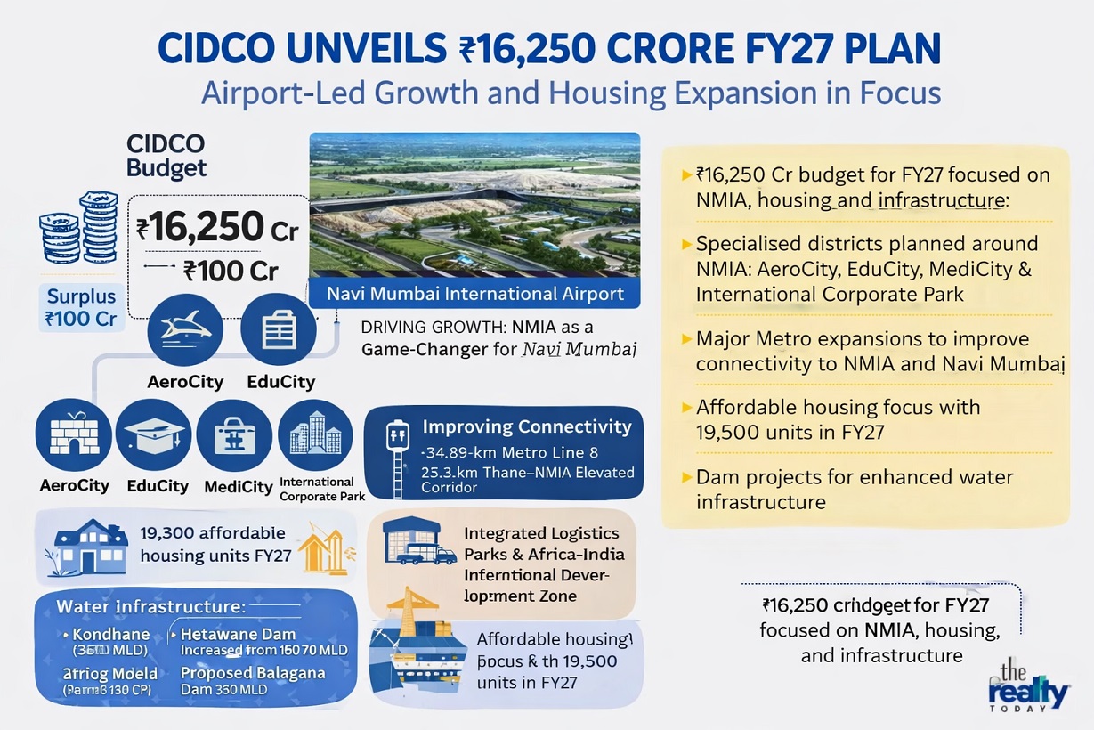 CIDCO has proposed a ₹16,250 crore budget for the fiscal year 2026-27, focusing on a futuristic budget, with a clear vision that focuses on infrastructure, airport-centric development, and housing in Navi Mumbai. It shows a clear-cut strategy aimed at making Navi Mumbai a globally competitive city while at the same time ensuring sustainable development in all sectors.