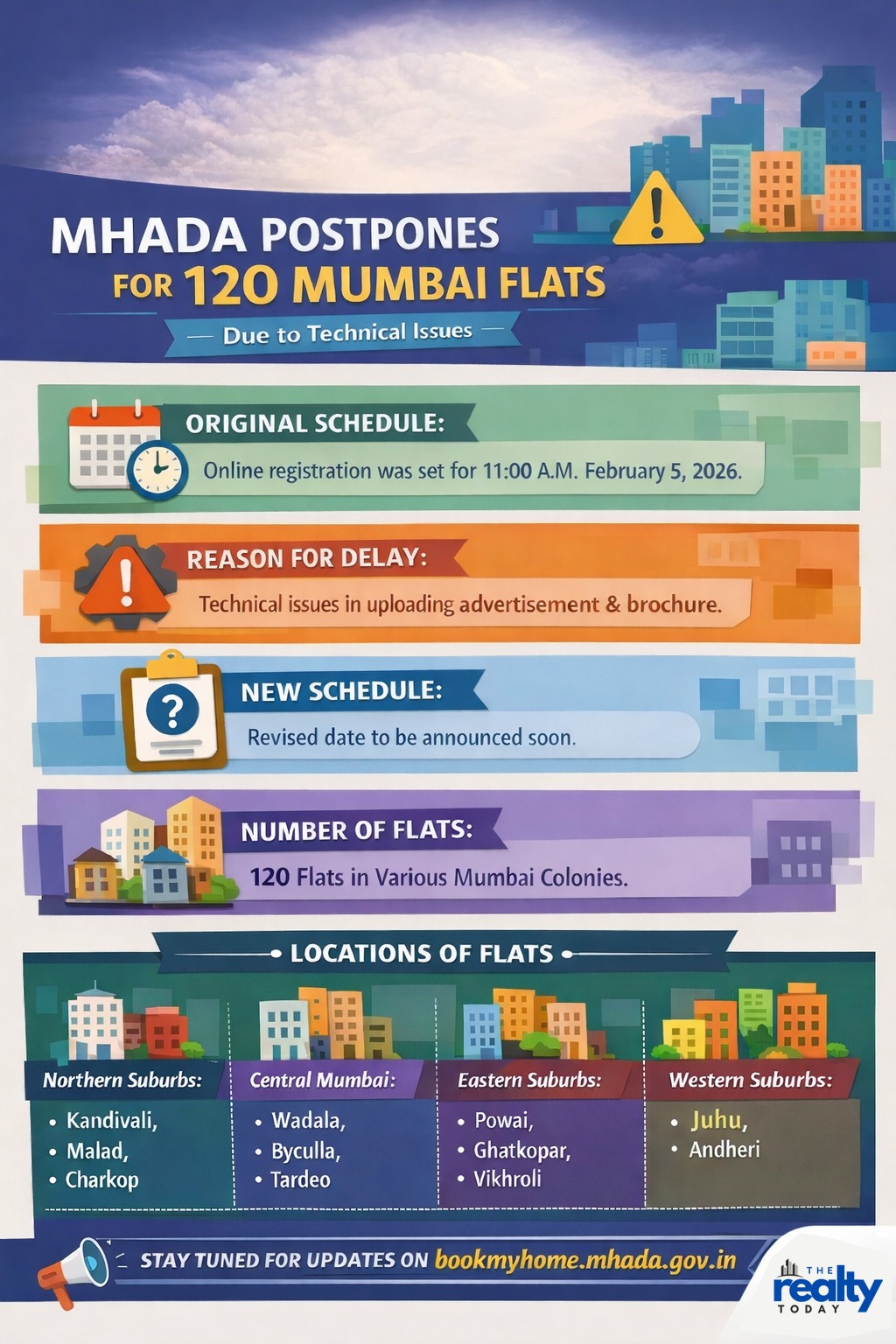 - Original Schedule: Online registration for 120 flats was set to begin at 11:00 a.m. on February 5 via MHADA’s portal bookmyhome.mhada.gov.in.