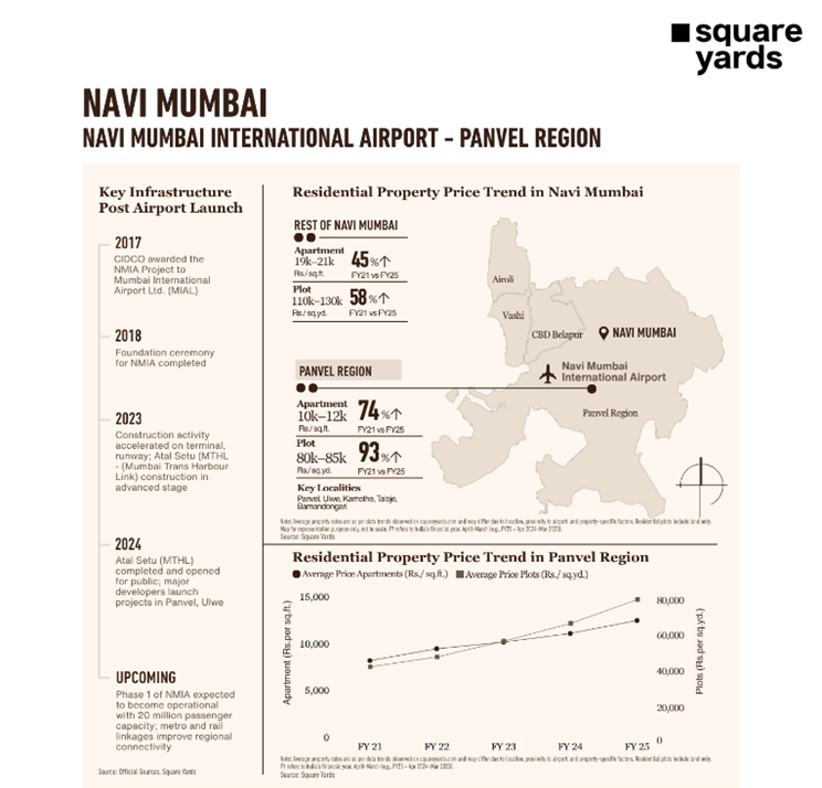 Mr Deepak Khandelwal, Principal Partner & Chief Sales Officer, Square Yards, said, “The Navi Mumbai International Airport stands as a cornerstone of the region’s broader infrastructure push, supported by major upgrades in road, rail, metro, and waterway connectivity. Its imminent operationalisation has already begun to reshape the real estate landscape, particularly across the Panvel region. Localities such as New Panvel, Old Panvel, Kharghar, Ulwe, and Taloja are witnessing a surge in development, with a growing supply of premium residential projects, gated communities, and large integrated townships. The market response has been strong, with apartment prices in the Panvel region rising by nearly 74% between FY 2021 and FY 2025, compared to 45% growth across the rest of Navi Mumbai. With the first phase to be inaugurated today and full-scale operations expected soon, the airport is set to drive the next wave of value creation, reinforcing Panvel’s position as one of the most promising growth hubs not only within the Mumbai Metropolitan Region and beyond.”
