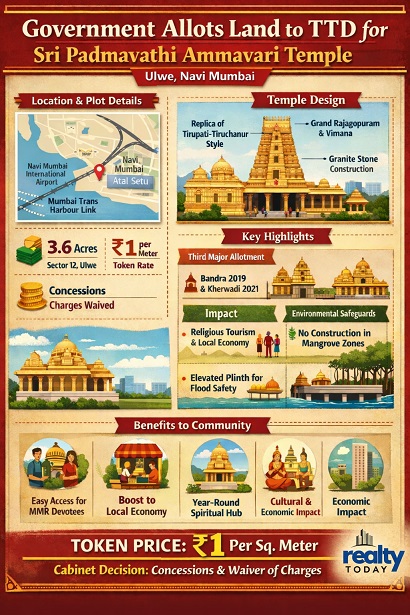 - Land Allocation & Location: 3.6-acre plot in Sector 12, Ulwe, Navi Mumbai, near the Navi Mumbai International Airport and Mumbai Trans-Harbour Link, allotted to Tirumala Tirupati Devasthanams (TTD)