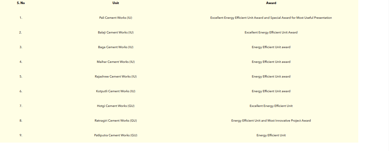 UltraTech’s other units that were felicitated with the Energy Efficient Unit Award include the integrated units of Maihar Cement Works in Madhya Pradesh, Rajashree Cement Works in Karnataka, and Kotputli Cement Works in Rajasthan. Meanwhile, 3 of UltraTech’s grinding units were also recognised, with Hotgi Cement Works in Maharashtra receiving an Excellent Energy Efficient Unit Award, Ratnagiri Cement Works in Maharashtra being honoured with both the Energy Efficient Unit Award and the Most Innovative Project Award, and Patliputra Cement Works in Bihar receiving the Energy Efficient Unit Award.